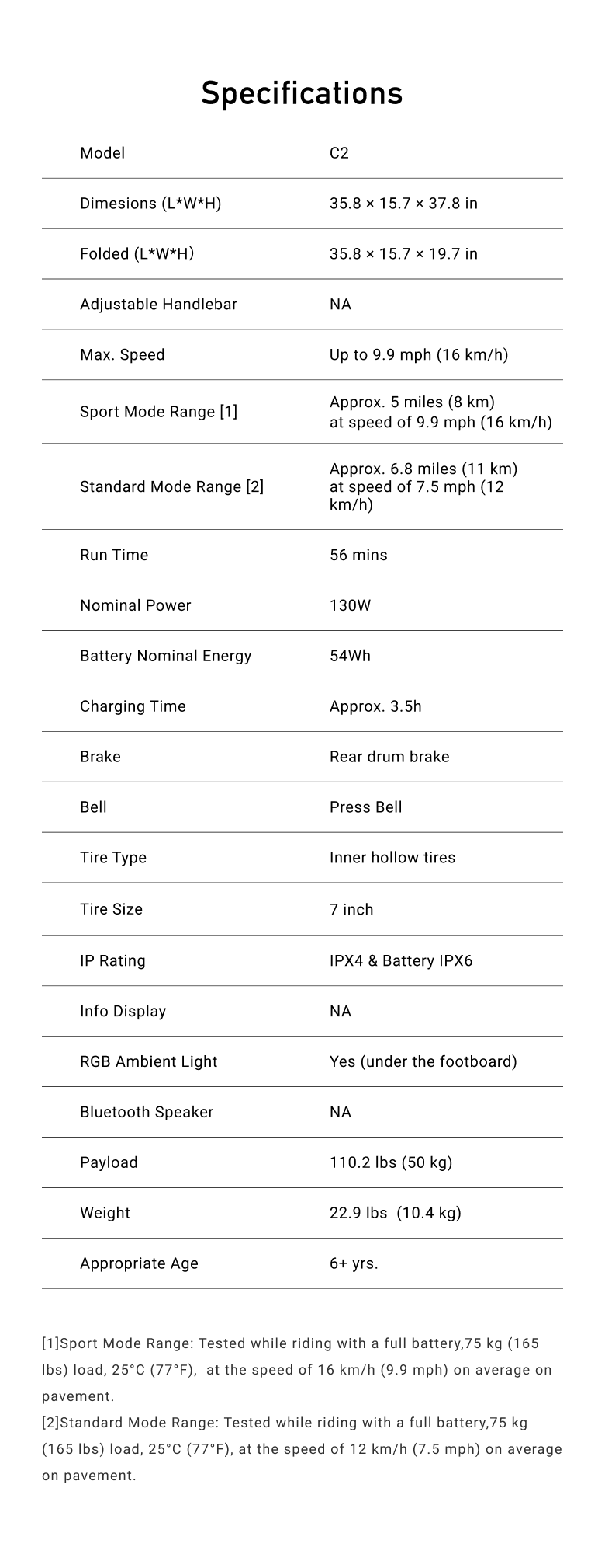 [1] Range at Max.Speed: Tested while riding with a full battery, 50 kg (110