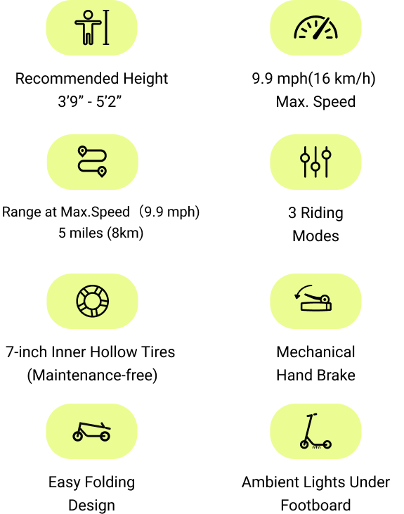 The C2 KickScooter adopts a 130W powerful brushless motor allowing kids the necessary force to speed up to 9.9 mph and ride freely. Thanks to the battery capacity, your child can enjoy the fun alone or with his/her friends in a radius of up to 5 miles !